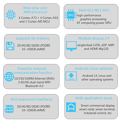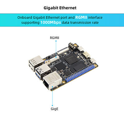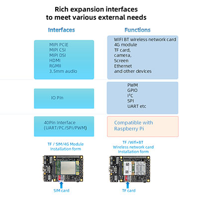 Одборот Gigabit Ethernet Port, RGMII, USB3.0/2.0, Mini PCLE, Mini HDMI, MIPI екран и MIPI камера и други периферни интерфејси, што доведува до 40 pin неискористени пинови, богати интерфејси за експанзија за да се задоволат повеќе развојни потреби!
