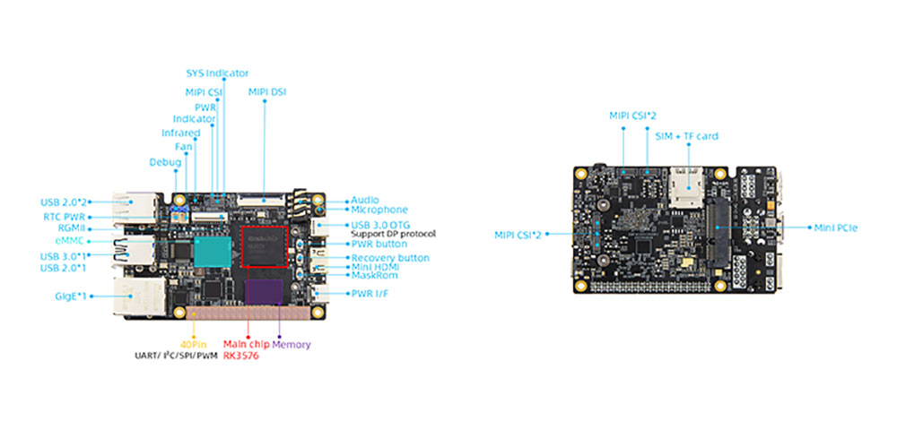 4. Порта за гигабит етернет, RGMII, USB3.0/2.0, Mini PCLE, Mini HDMI, MIPI екран и MIPI камера и други периферни интерфејси, што доведува до 40 -тина неискористени иглички, богати експанзија интерфејси за да се задоволат повеќе развојни потреби!