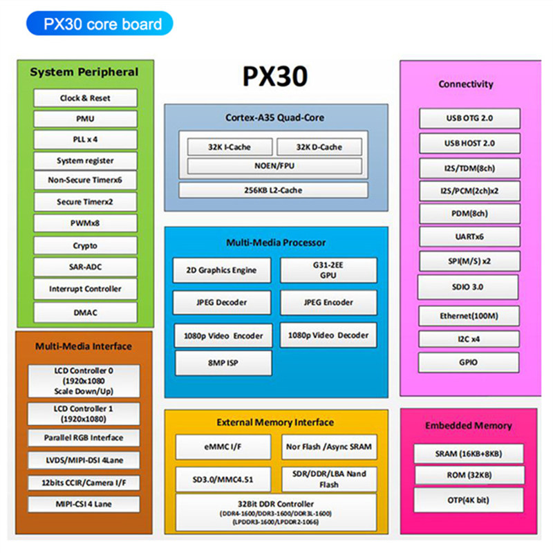 1. Системот TC-PX30 на модулот се заснова на Rockchip PX30 64 Bit Quad-Core A35 процесор. Фреквенцијата е до 1,3GHz. Интегрирано со графички процесор Mali-G31, поддржува Opengl ES3.2, Vulkan 1.0 , Opencl2.0, 1080p 60fts, H.264 и H.265 видео декодирање. Тој е дизајниран со 1 GB/2 GB LPDDR3, 8GB/16GB/32 GB EMMC.