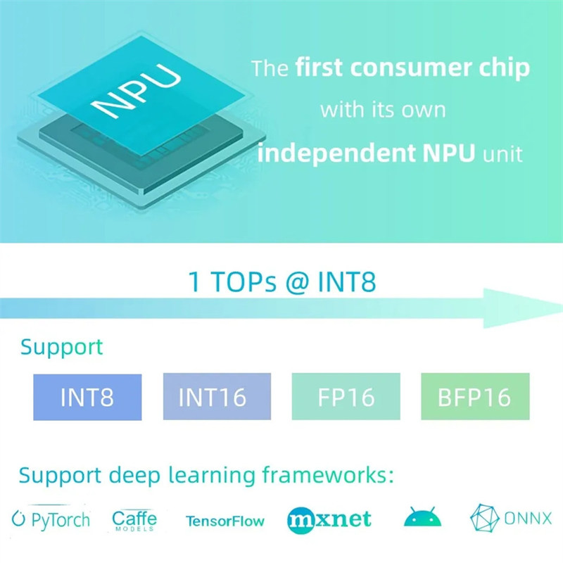 • GPU поддржува Opengl ES3.2/2.0/1.1, Vulkan1.1; VPU може да реализира 4K 60FPS H.265/H.264/VP9 видео декодирање и 1080p 100fps H.265/H.264 видео кодирање; NPU поддржува Caffe/TensorFlow и други мејнстрим со еден клик на вклучување на модели на архитектура.