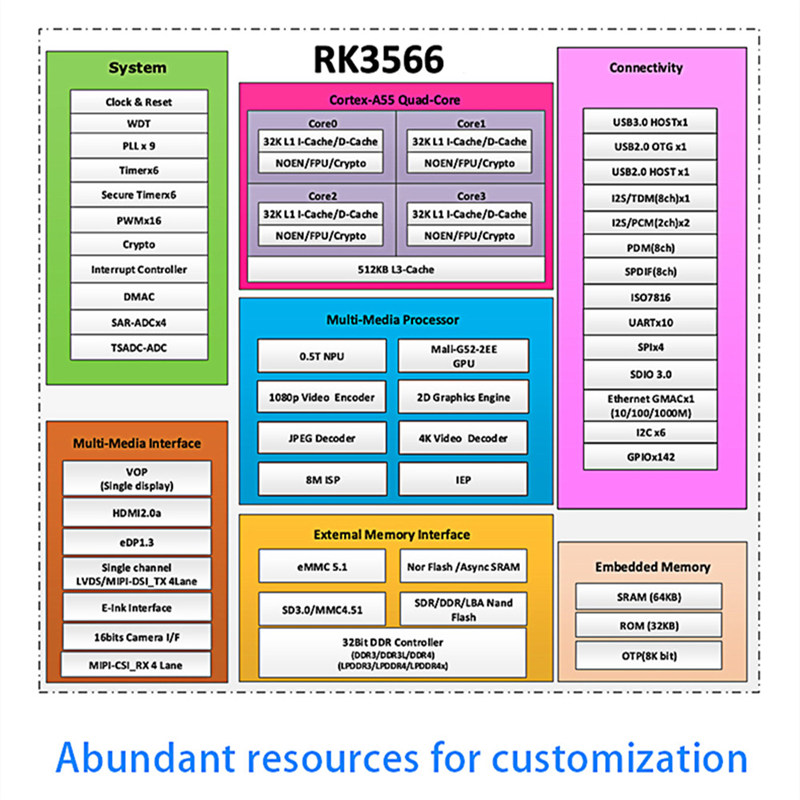 • RK3566 усвојува напредна технологија од 22nm, со главна фреквенција до 2,0GHz, процесорот може да биде опремен со капацитет на меморија до 8 GB, кој може да достигне ширина од 32bit, и фреквенција до 1600MHz.